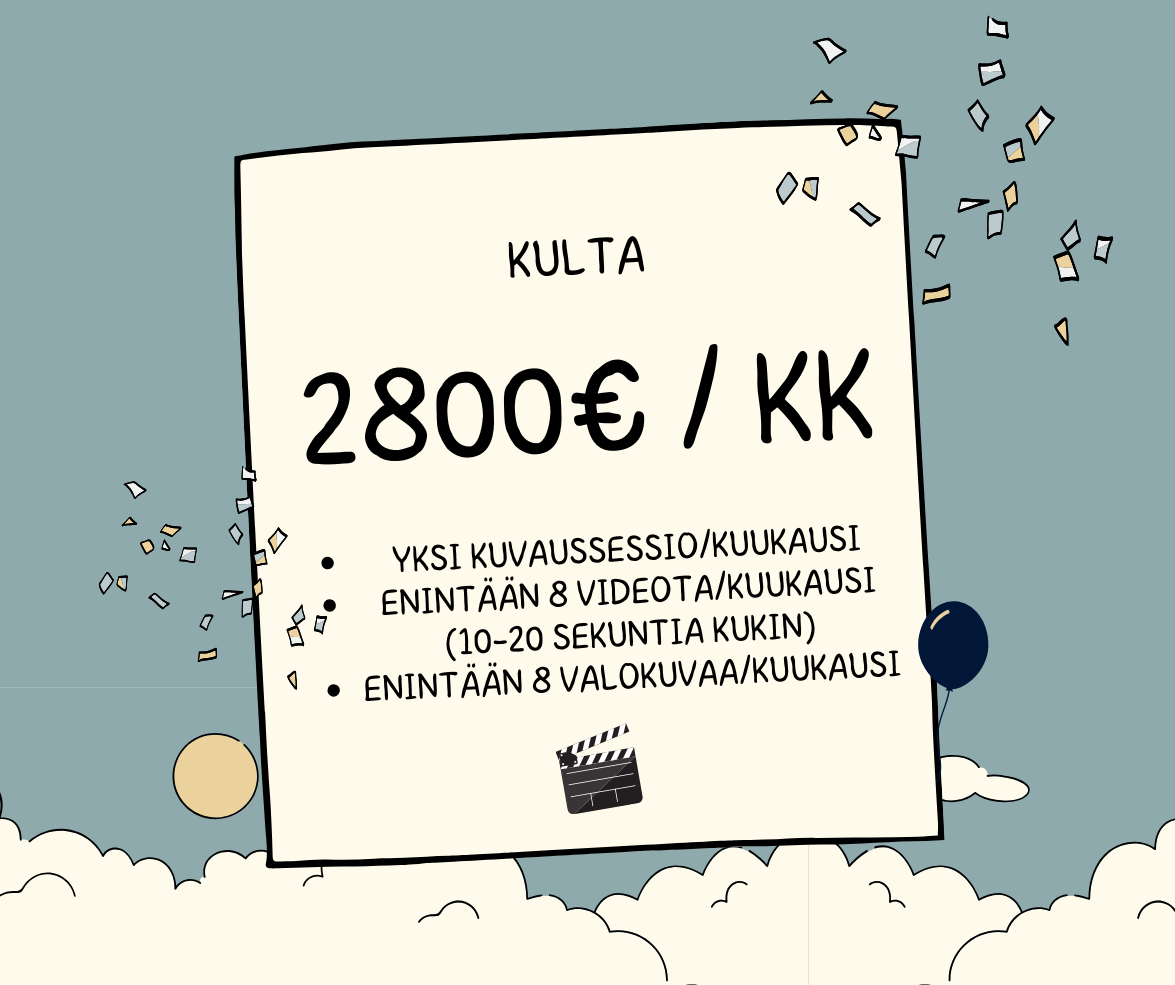 Päätät itse, kuinka paljon haluat osallistua prosessiin. Jos sinulla on kiire, voimme hoitaa kaiken, ideoinnista kuvaamiseen asti. Kuitenkin mielellämme suunnittelemme teidän kanssa yhdessä mitkä ovat tarpeet jokainen kuukausi ja mitkä ovat tuotannon tavoitteet.